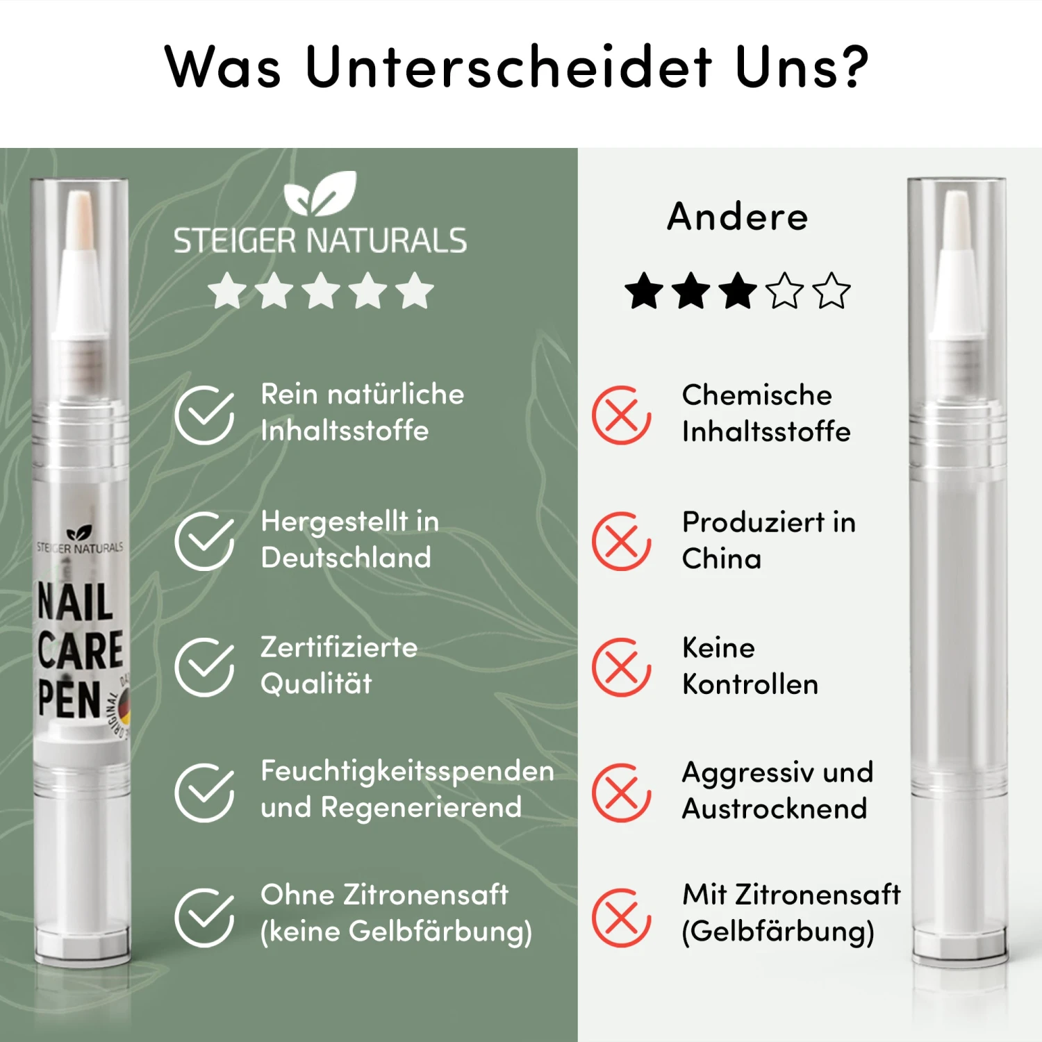 Der Nagelpflegestift von Steiger Naturals ist ein ideales Hilfsmittel für die tägliche Nagelpflege. Er ist nicht nur für die allgemeine Pflege geeignet, sondern auch zur kosmetischen Unterstützung bei Nagelpilzproblemen.